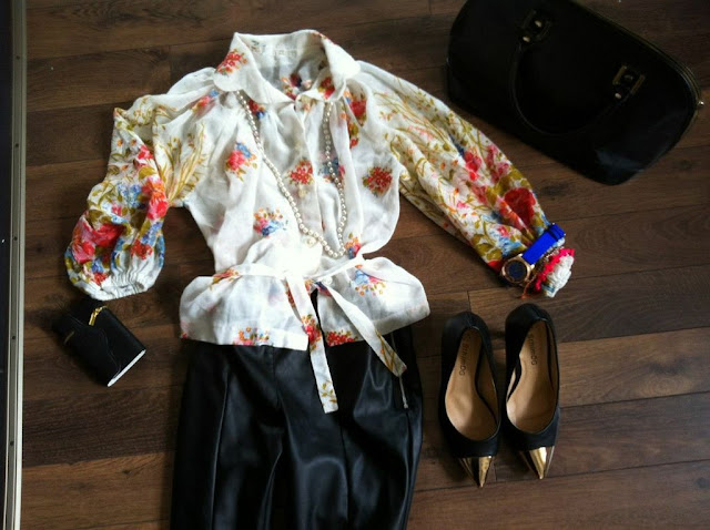Blommig skjorta (mammas gamla :)), läderbyxor (PU läder) HM 299 kr, skor svarta pumps DG Stockholm, blå klocka Marc by Marc Jacobs, orange armband i tråd och pärlor Ale-Hop, rosa armband med kors från bazar i Spanien, pärlhalsband (gammalt), mobilfodral/plånbok Kjell o Company 179 kr, väska LV.